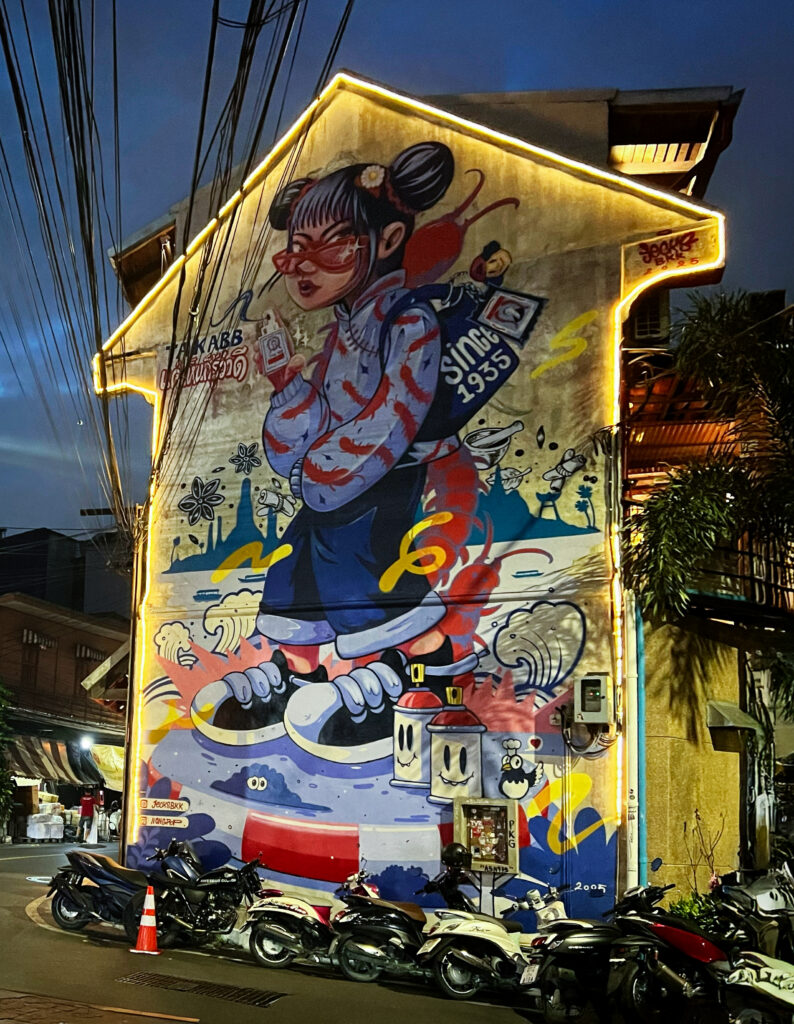 A large mural covers a building on Song Wat Road in Bangkok’s Samphanthawong district, adding a burst of modern energy to the city’s historic Chinatown. Below, motorbikes and cars move past old shops and street vendors, blending contemporary street art with the enduring character of old Bangkok.
